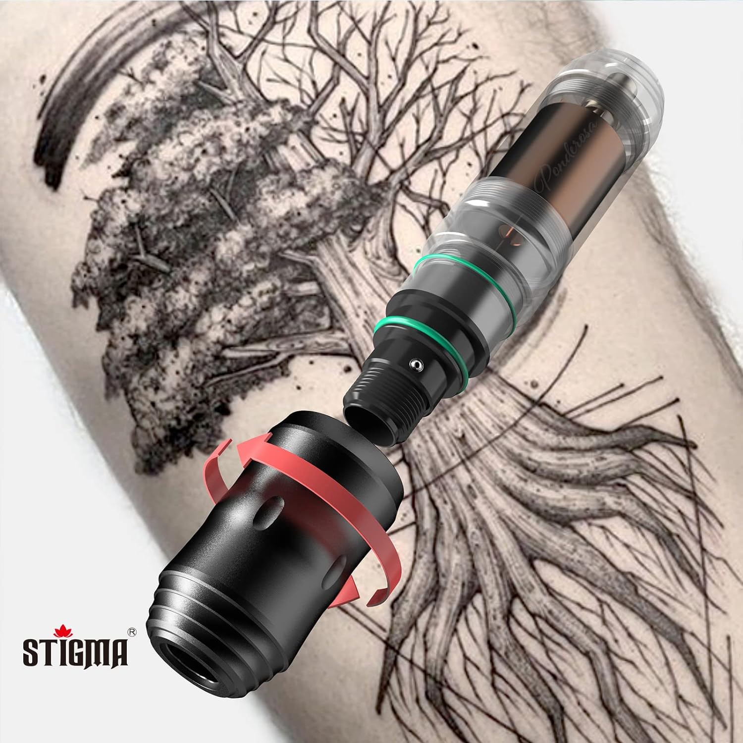 Además, la máquina de tatuaje Stigma utiliza un motor sin núcleo de alta velocidad y un concepto de diseño interno único que resuelve problemas comunes de las máquinas de tatuaje tradicionales, como líneas de corte cansadas, fugas de color y líneas de corte falsas. La máquina también se puede utilizar con las fuentes de alimentación universales actuales.