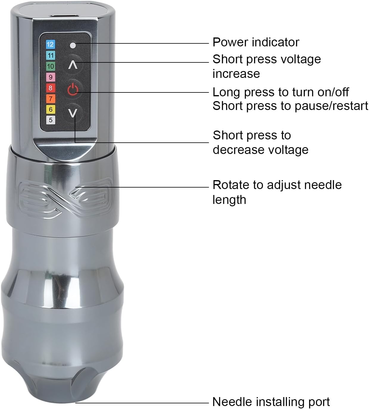 R: El lápiz de tatuaje inalámbrico cuenta con una bola de acero de posicionamiento ajustable que permite un ajuste preciso de la longitud de la aguja. Con 2 bolas de acero inoxidable incorporadas, produce un sonido nítido cuando se gira, lo que garantiza un tatuaje preciso.