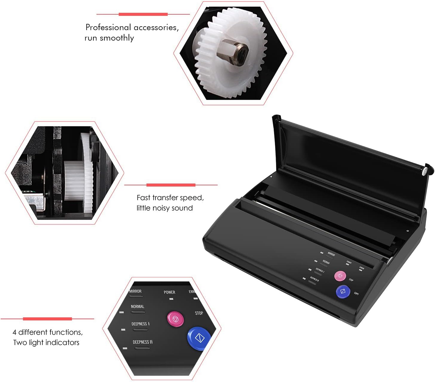 Cuenta con un diseño único de cubierta de impresión de plantillas que es fácil de abrir y cerrar, permitiéndote sostener el papel para una mejor copia. Además, tiene 5 botones con diferentes funciones que te permiten seleccionar métodos de copia, resoluciones, profundidades, entre otros, lo que la convierte en una herramienta muy práctica y funcional.