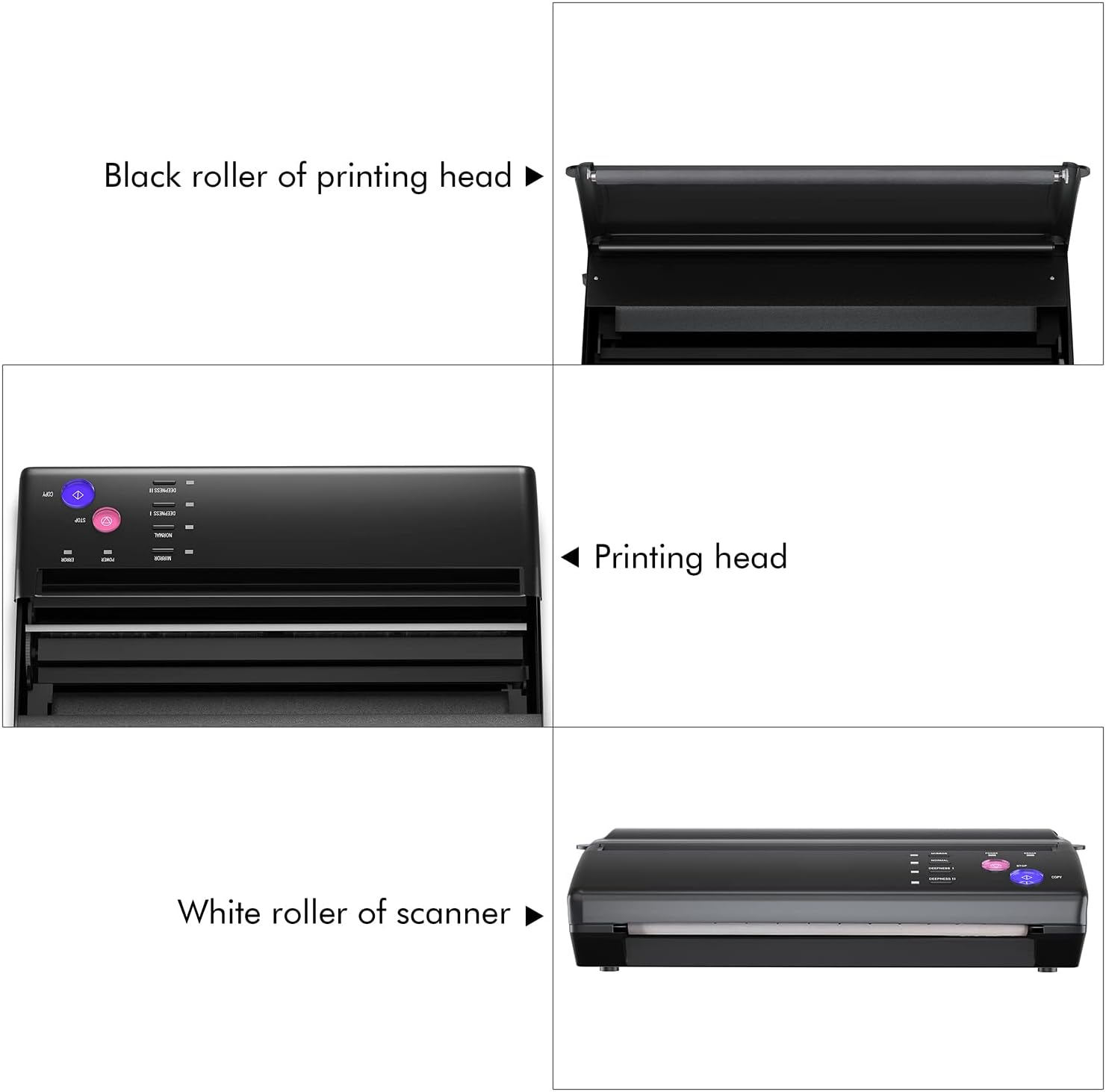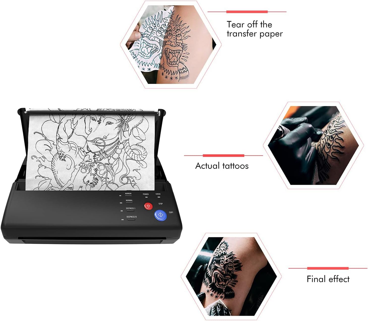 Aunque la copiadora térmica de tatuajes no es adecuada para patrones con sombras complejas, puedes transferir eficazmente líneas simples y complejas, patrones sin sombras y patrones de color. Sin embargo, las sombras complejas, patrones de color y patrones de fondo oscuro no se transfieren correctamente y pueden causar atascos de papel.