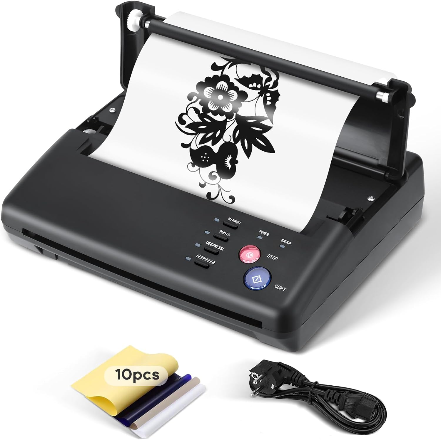 Además, la copia espejo y copia normal con advertencia de sobrecalentamiento te permiten elegir entre diferentes ajustes de copia para que coincidan con tu modelo. Incluye 10 hojas de papel de calco de tatuajes.
