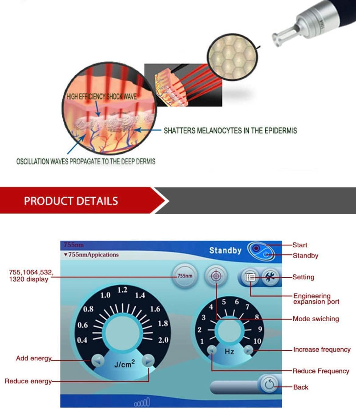 El láser de picosegundos de conmutación Q utilizado en esta máquina permite un tratamiento rápido y no invasivo, ideal para eliminar pigmentos persistentes y cicatriciales. Además, su pantalla táctil LCD de 8 pulgadas facilita la visualización y control de los parámetros de tratamiento.