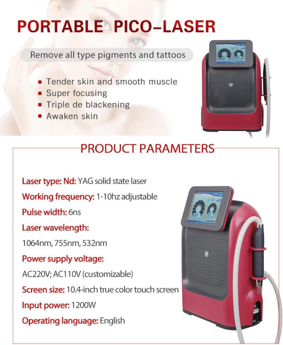 Esta máquina láser de picosegundos puede eliminar pigmentos de tatuajes de colores negros, azules, marrones y rojos, así como tratar manchas como pecas, manchas de café con leche, manchas de la edad, nevus de Ota, líneas bordadas, delineador de ojos y pigmentos de cejas.