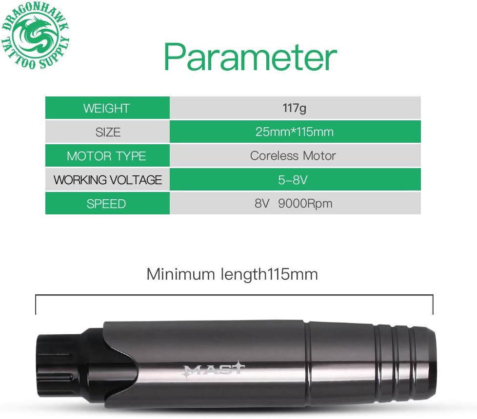 Esta máquina de tatuaje es compatible con todas las inyecciones tubulares comunes y se recomienda el uso de cartuchos de 0,20 mm o 0,25 mm para cejas, delineadores y labios. El diseño del bolígrafo MAST P10 está pensado para ofrecer la sensación de un bolígrafo real, con tecnología de procesamiento óptico que garantiza un rendimiento excepcional.