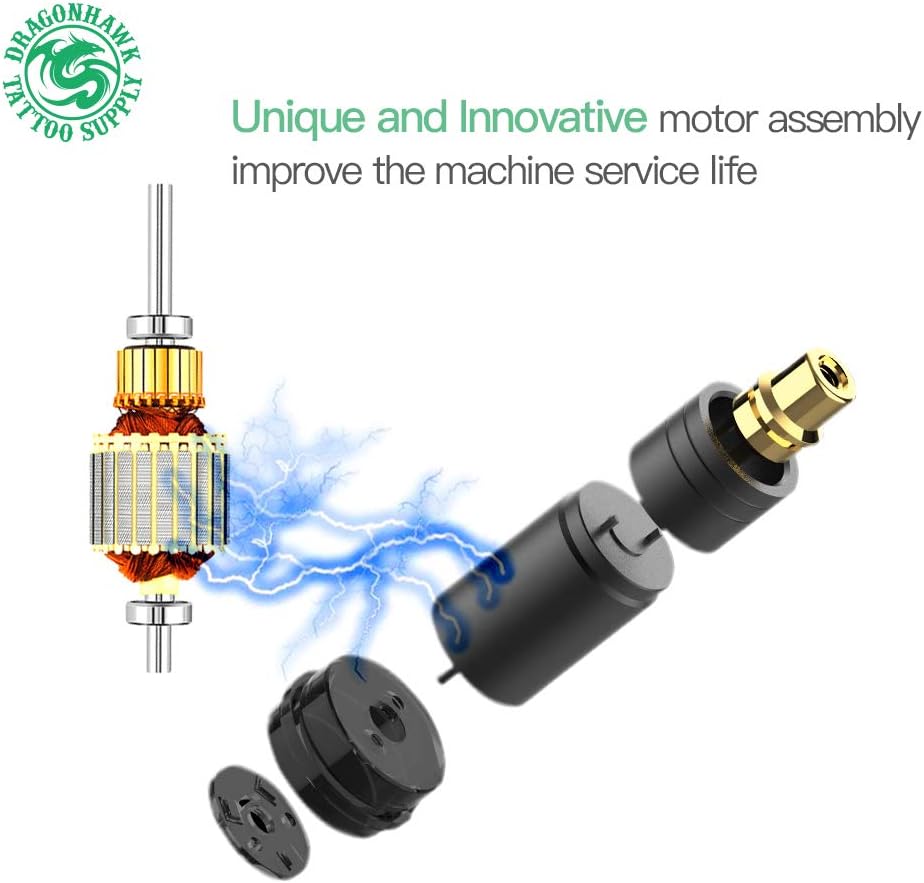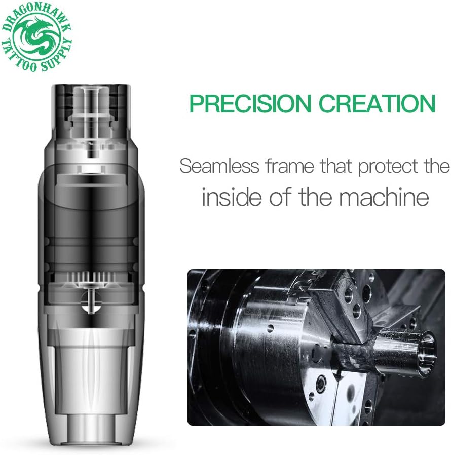 Está fabricada con una carrocería de aleación de aluminio de calidad aeronáutica que garantiza durabilidad y resistencia. Los motores sin núcleo personalizados ofrecen estabilidad y alta frecuencia para poder realizar una variedad de estilos de tatuajes.