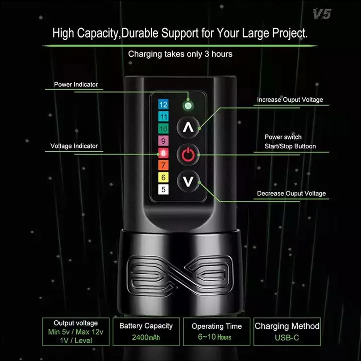 La máquina de tatuaje inalámbrica de TABKER es la herramienta ideal para artistas del tatuaje que buscan calidad y comodidad en su trabajo. Con una batería de litio de 2400 mAh de alta capacidad, esta pistola de tatuaje te proporcionará hasta 8 horas de trabajo continuo con una sola carga, lo que la convierte en el compañero perfecto para proyectos grandes.
