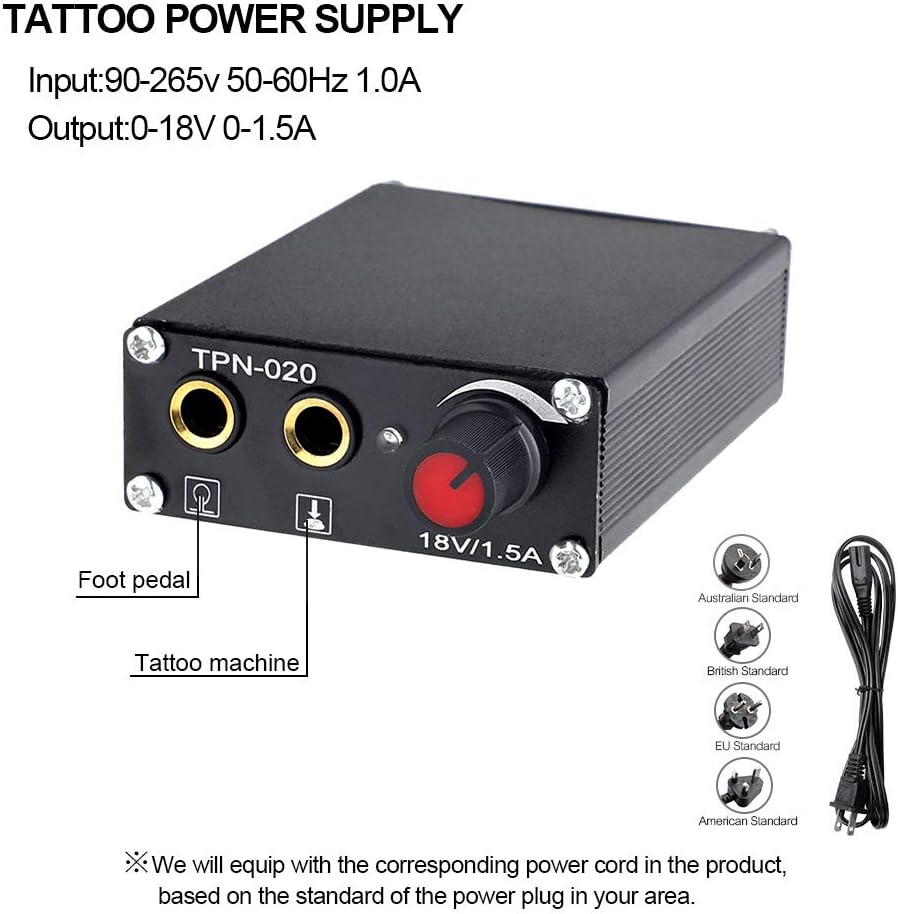 Además de las máquinas de tatuaje y la fuente de alimentación, el kit incluye 20 agujas de tatuaje, 30 vasos de tinta y otros accesorios necesarios para realizar tatuajes de calidad.