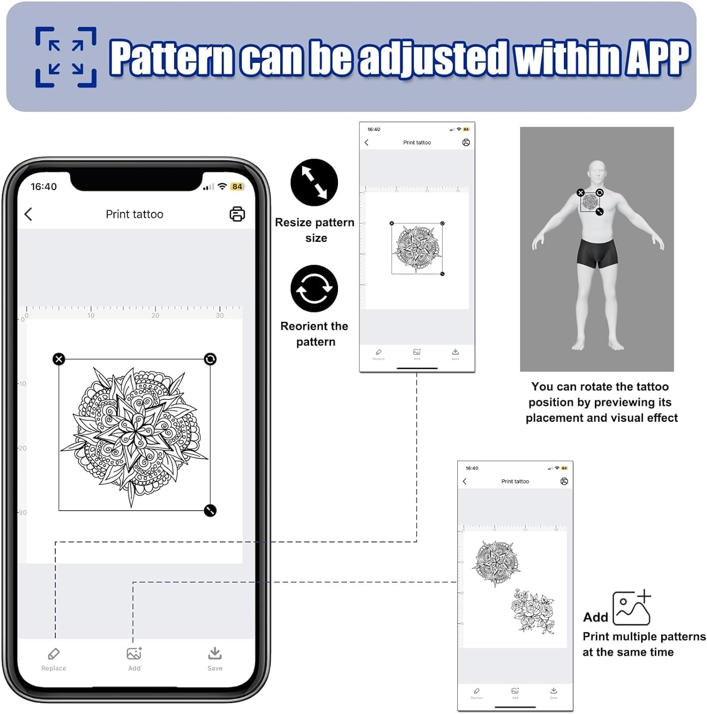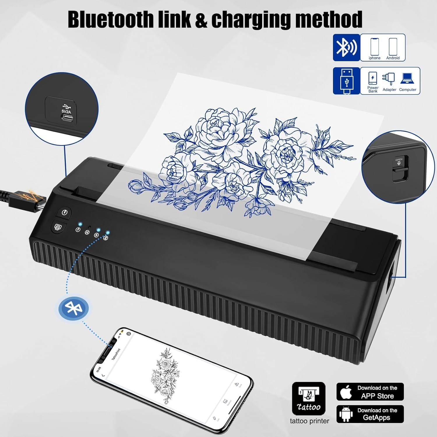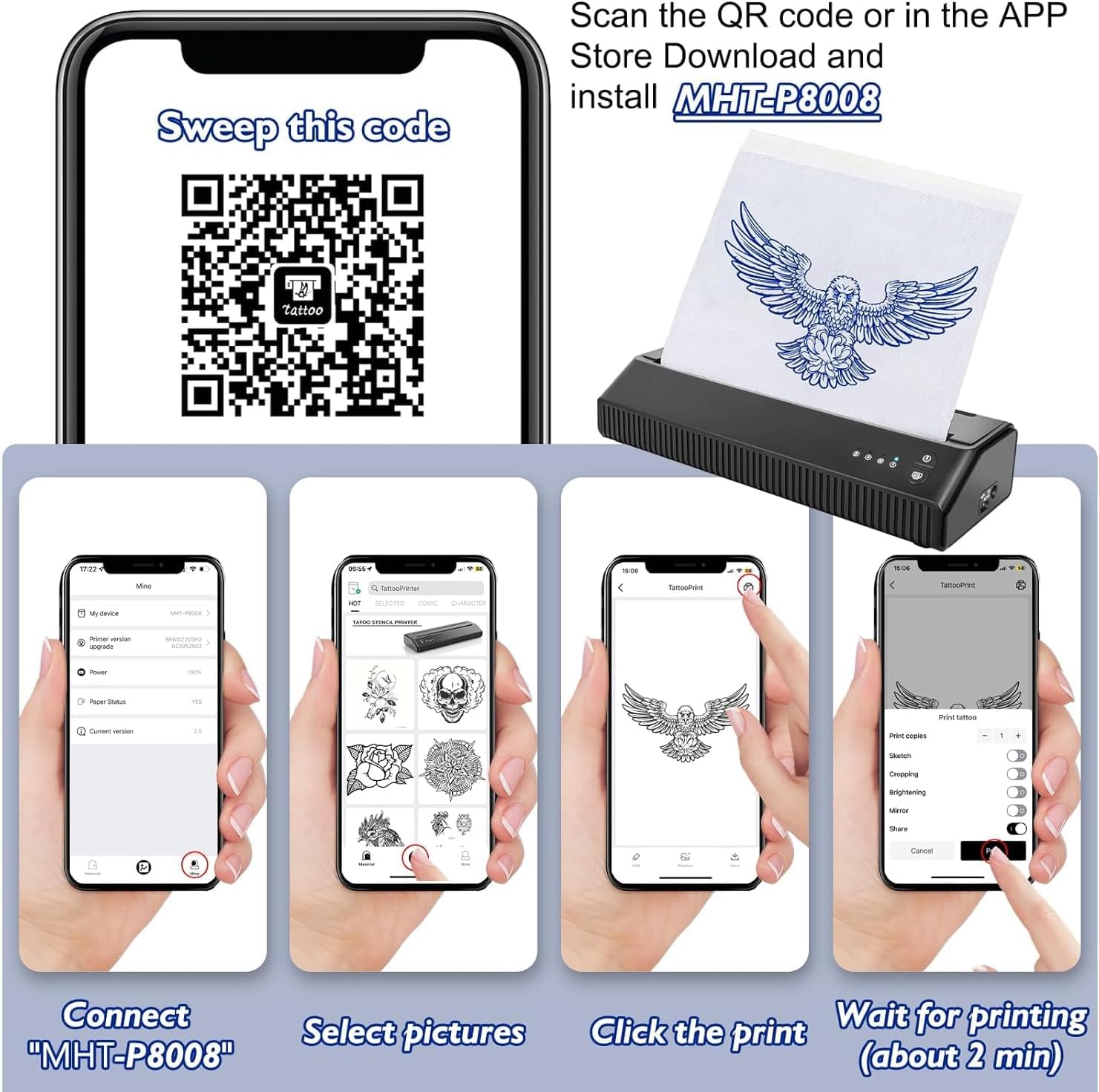 Para utilizar la máquina de transferencia de tatuajes de MOKOHOA, simplemente descarga la APP exclusiva «TattooPrinter» de la App Store o escanea el código QR para descargar la aplicación. Esta aplicación te permite editar, agregar, personalizar y generar plantillas, permitiéndote imprimir diferentes imágenes de tatuajes en el álbum de tu teléfono a través del control de la aplicación.