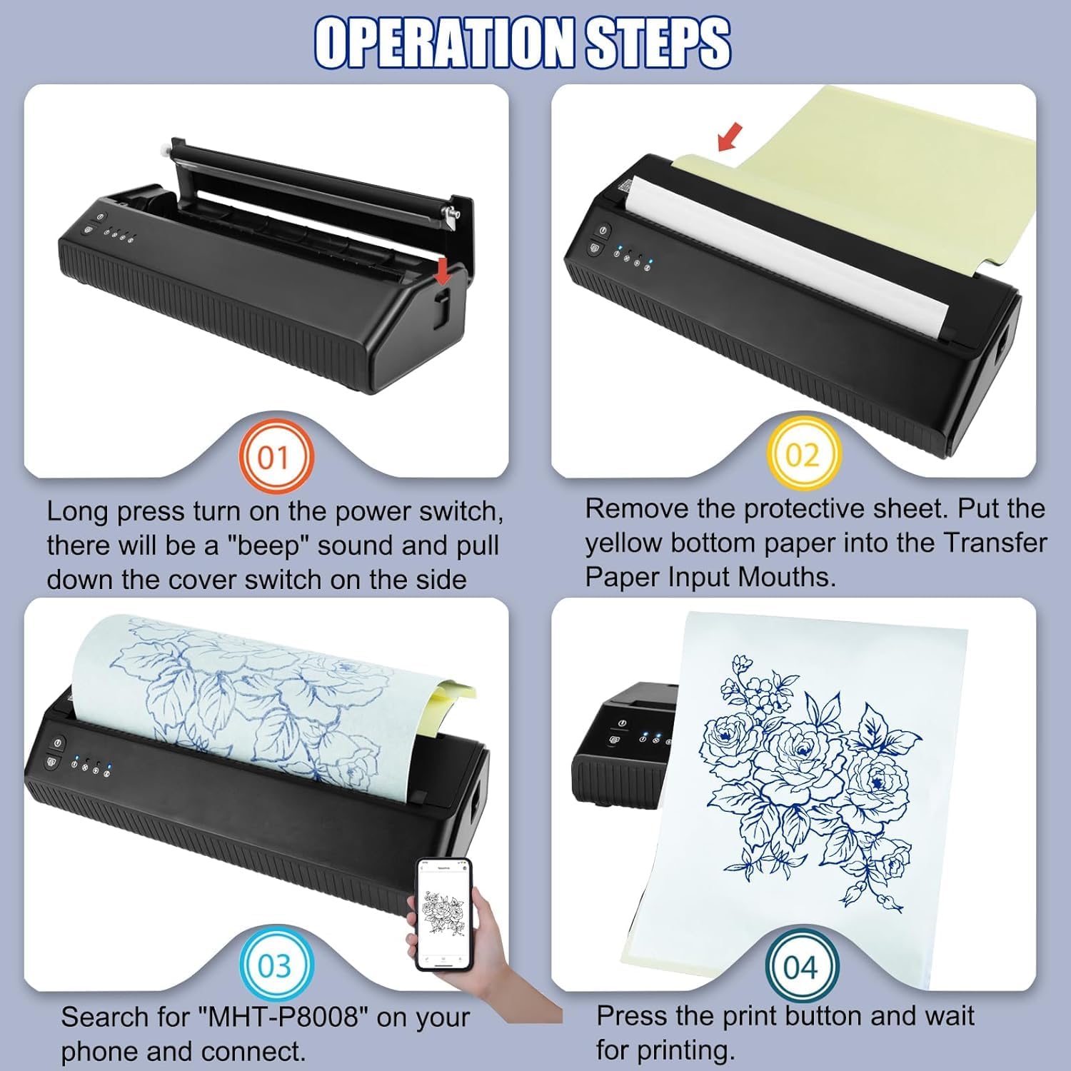 Además, la máquina de transferencia de tatuajes de MOKOHOA es extremadamente versátil, ya que es compatible con una amplia gama de dispositivos, incluidos teléfonos inteligentes y computadoras. Esto te brinda la flexibilidad de transferir diseños desde una variedad de fuentes, ya sea que estés trabajando en un diseño personalizado o imprimiendo uno existente.